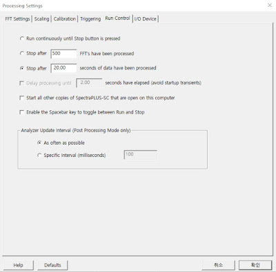 마이크로폰으로 3 파스칼 (Pascals) 이상의 압력 소리가 입력시 트리거가 시작되고, 트리거가 시작된 시점 부터 약 20조 후 자동멈춤이 된 SpectraPLUS-SC 소프트웨어 테스트 사진